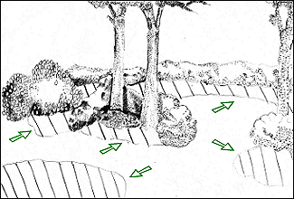• Imitálhatunk hasadékokkal átszőtt lepusztult sziklafelszíneket is. Ilyenkor nagyobb méretű laposabb sziklákat illesztünk szorosan egymás mellé, csak néhány centiméteres rést hagyunk közöttük, melyeket beültetünk sziklahasadék lakó növényekkel.